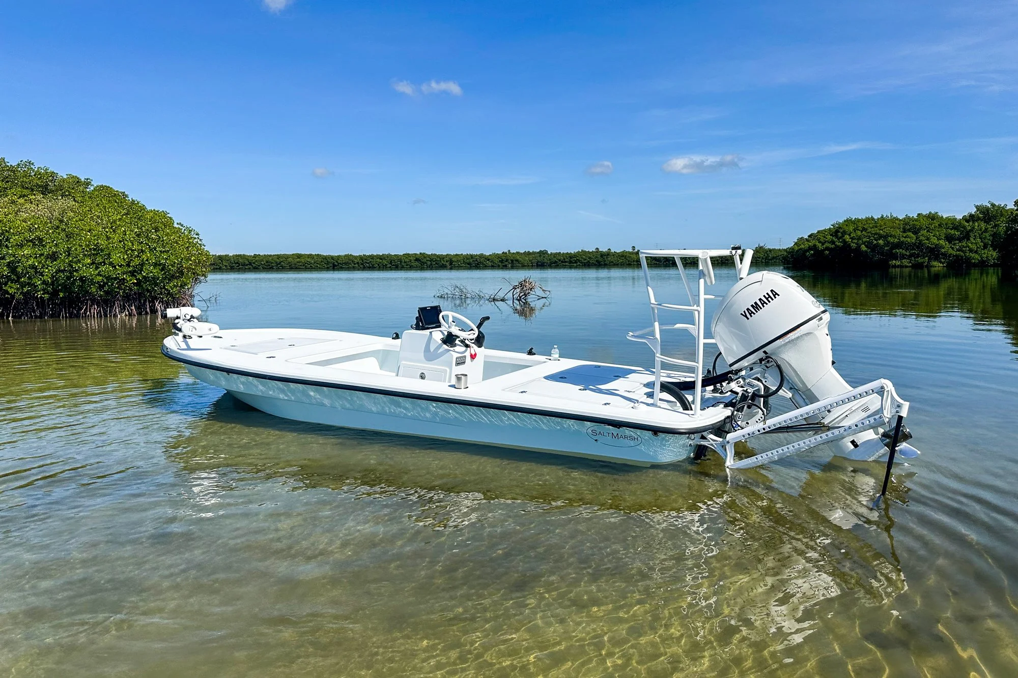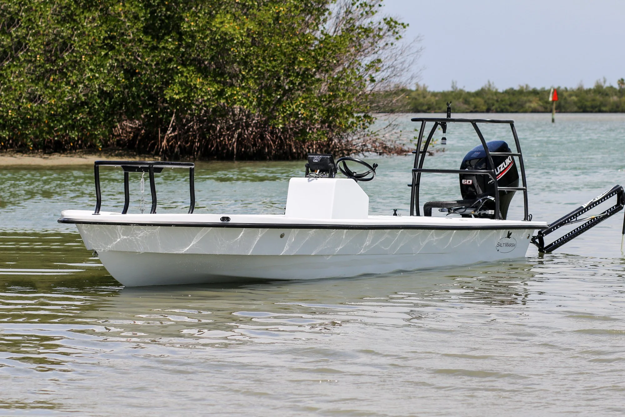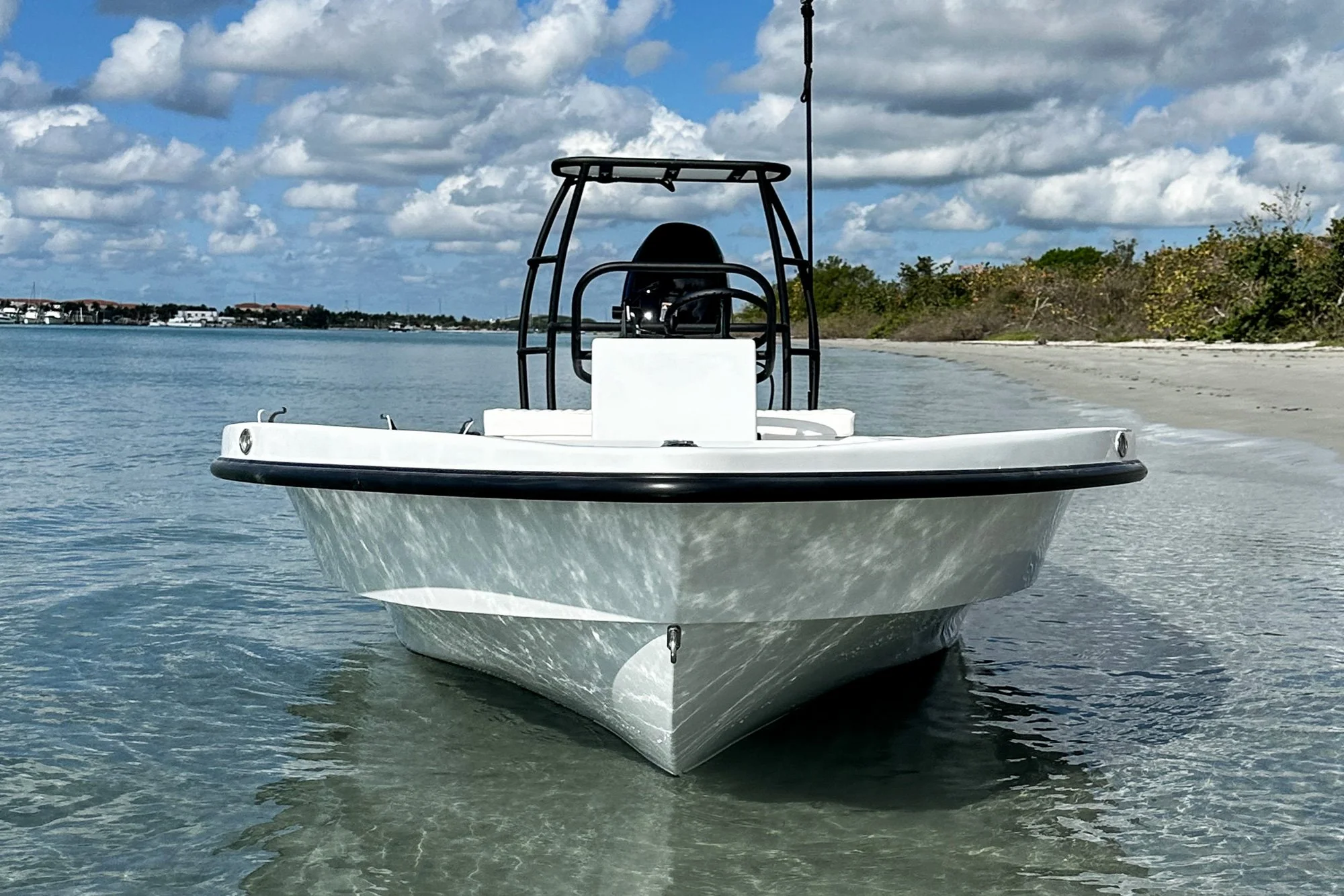 Still, it’s very much a poling skiff, as opposed to a flats boat. A 650 lb. dry weight and 6˚deadrise translate to an 8–10” draft — depending on power and load — while an innovative Variable Radius Transom improves water flow around the aft corners for poling performance on par with skiffs a foot and a half shorter.