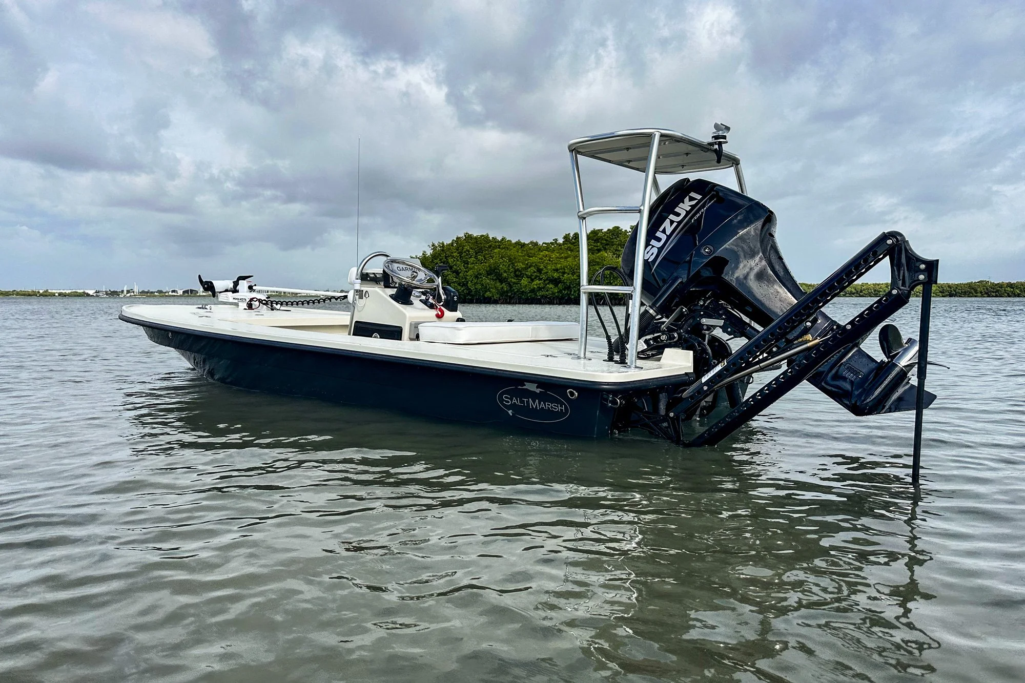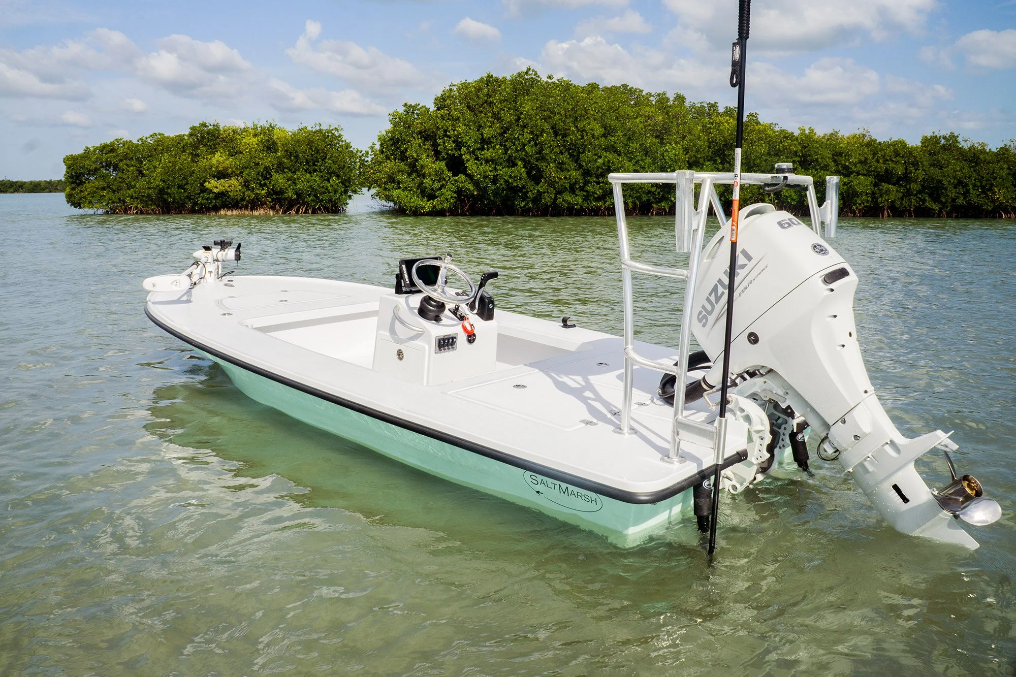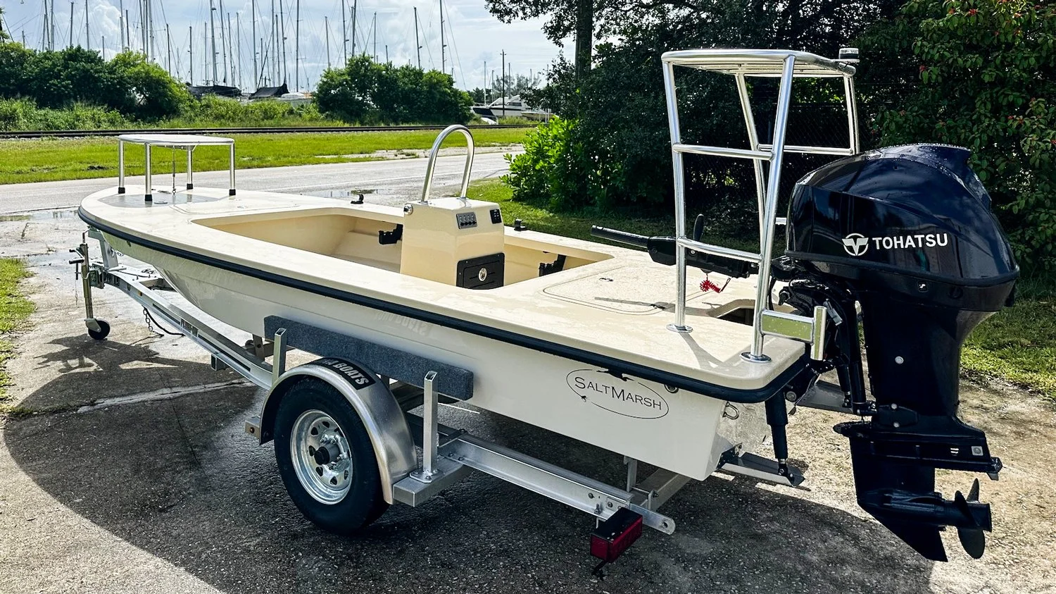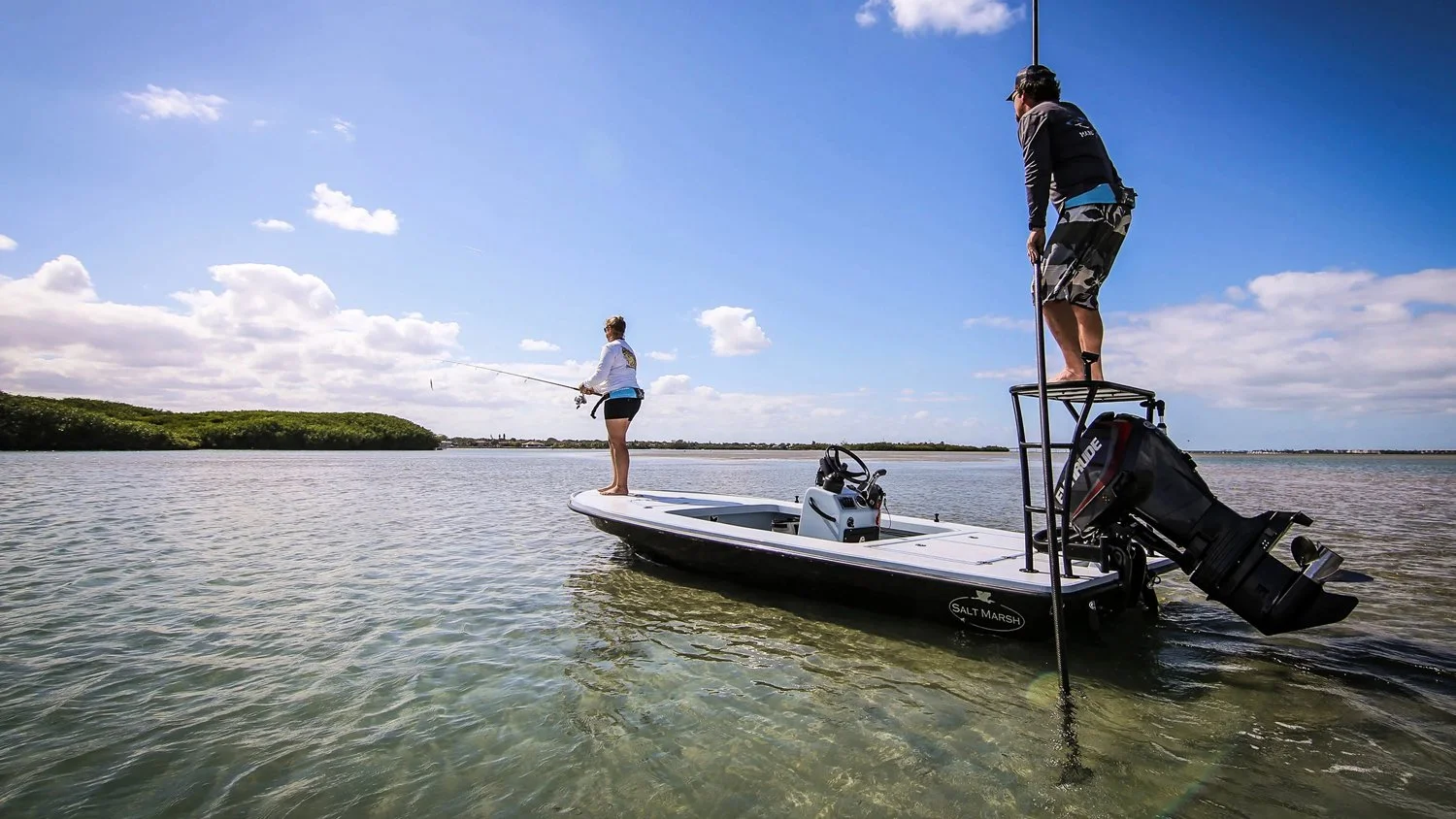 Add a platform to almost any small, lightweight boat and you can call it a poling skiff. But a true technical poling skiff is a different animal — specifically designed to eliminate any noise from ripples slapping against the hull, to balance level for minimum draft with one person on the platform and one or two anglers on the bow, and to track straight at poling speed, even across or into the wind. While there are less expensive ways to get on the water, the Heron 16 is arguably the most affordable true technical skiff on the market, starting around $26,000 ready to fish with a tiller 40 hp Suzuki and quality aluminum trailer.