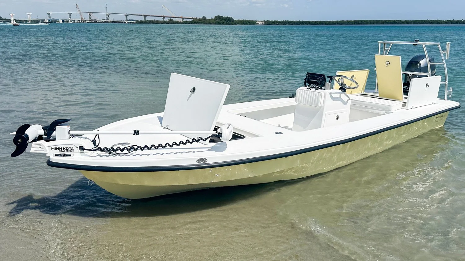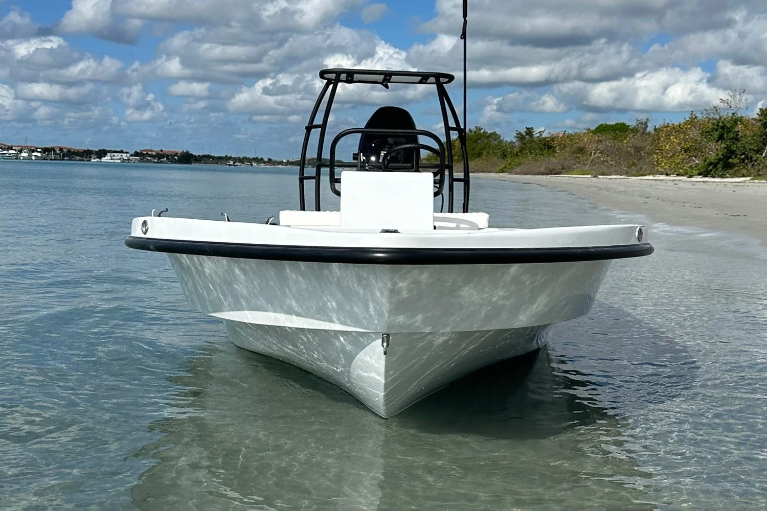 Still, it’s very much a poling skiff, as opposed to a flats boat. A 650 lb. dry weight and 6˚deadrise translate to an 8–10” draft — depending on power and load — while an innovative Variable Radius Transom improves water flow around the aft corners for poling performance on par with skiffs a foot and a half shorter.